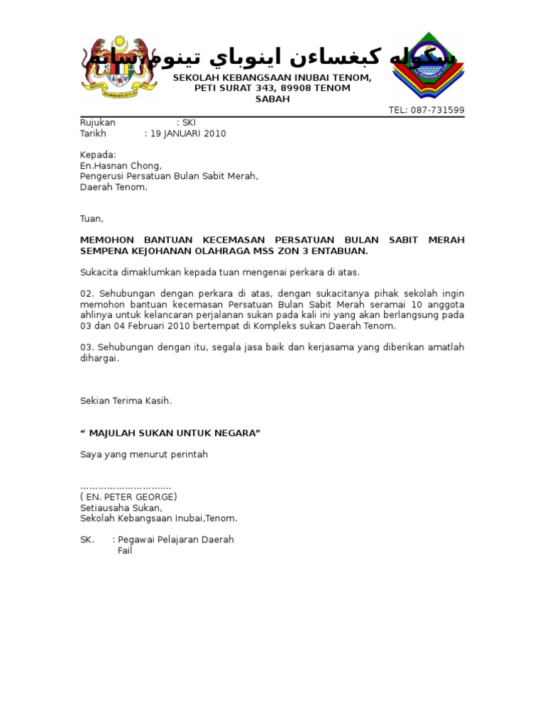 Contoh Surat Rasmi Memohon Bantuan Kepada Yb